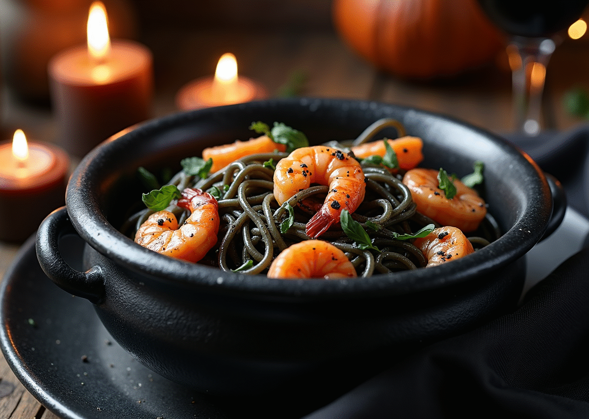 A gothic twist on a seafood classic — glossy black squid ink pasta bubbling with shrimp, garlic, and chili. Sinisterly delicious.